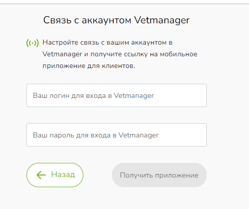 Следующий шаг —  введите логин и пароль для входа в программу Ветменеджер. (Тут нужны те данные, которые вы используете для входа в программу. Логин может быть, например, admin)