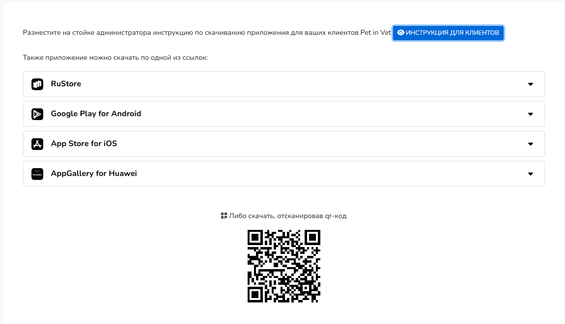 Здесь вы можете распечатать QR-код для скачивания приложения клиентами. При клике на кнопку Инструкция для клиентов откроется брошюра с инструкцией и QR-кодом для клиента.