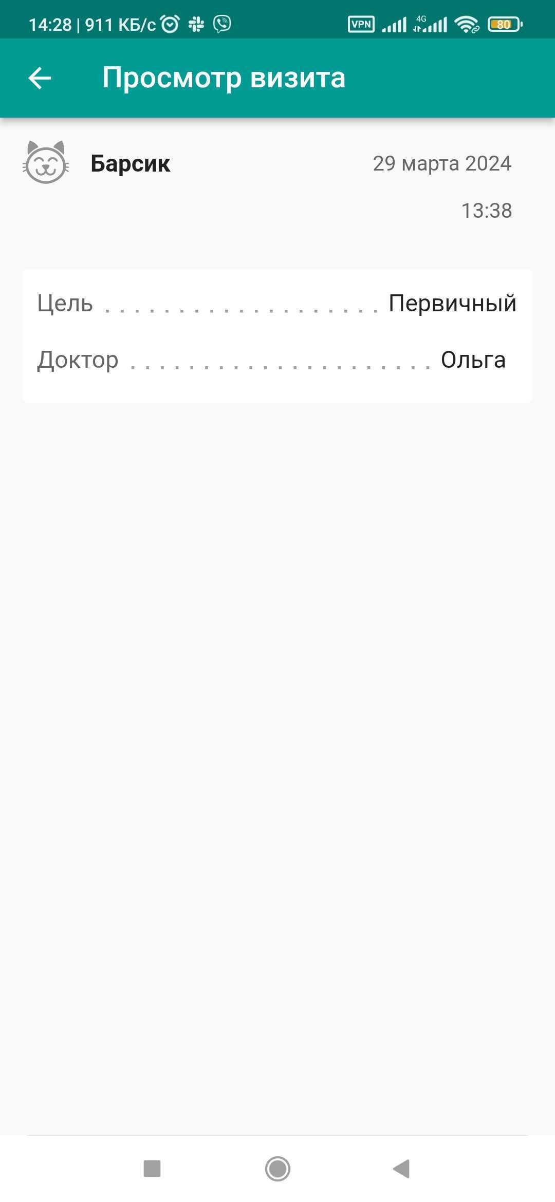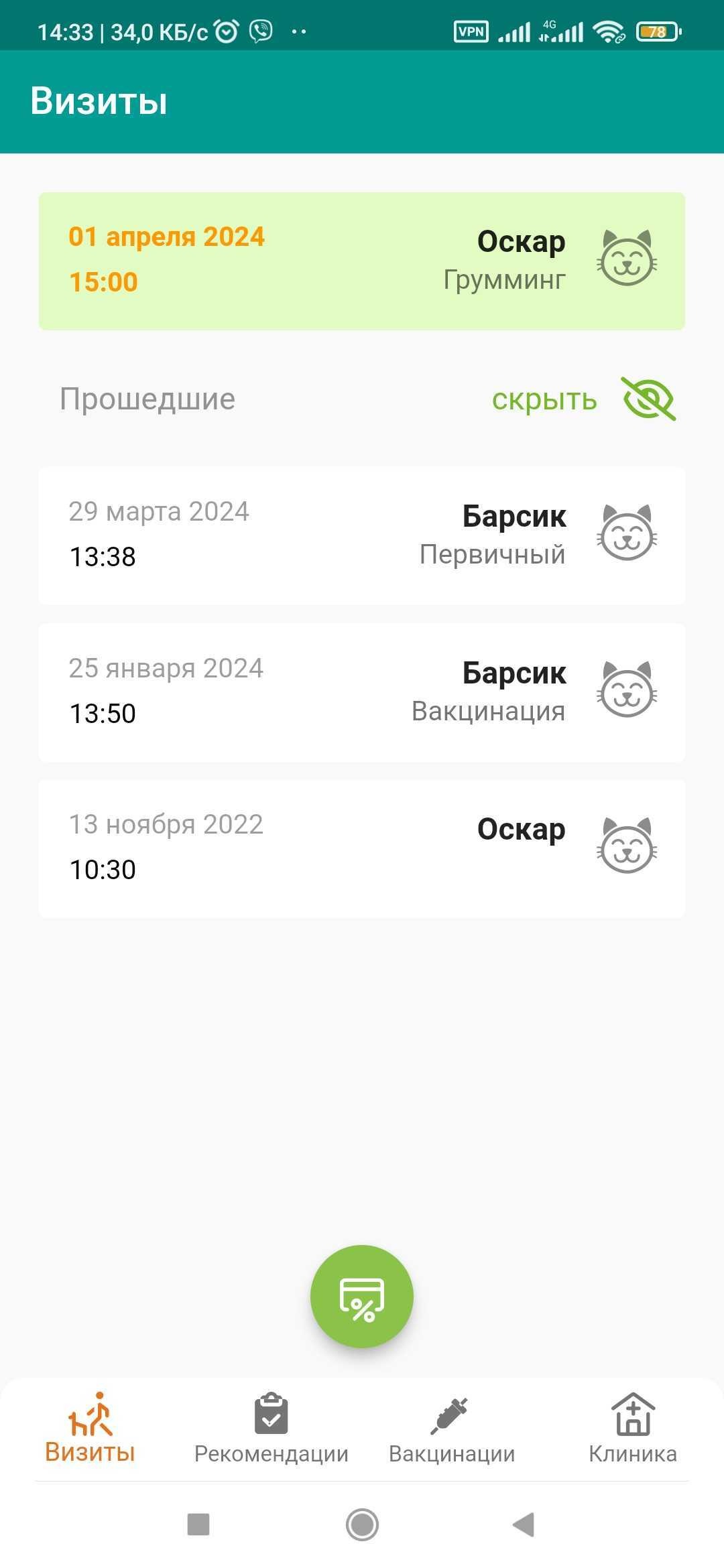 • запланированные/прошедшие визиты в клинику (видна такая информация: дата, цель обращения, питомец, доктор);