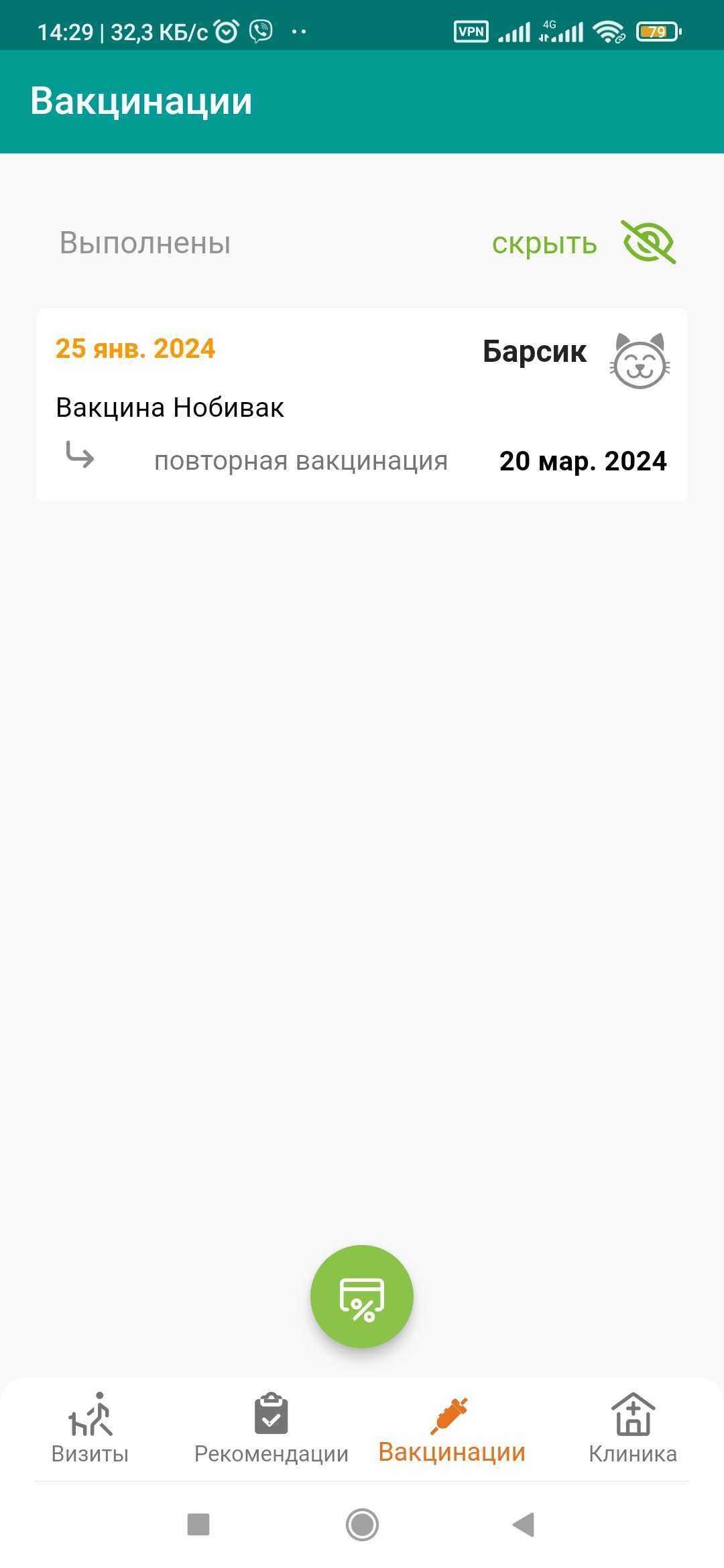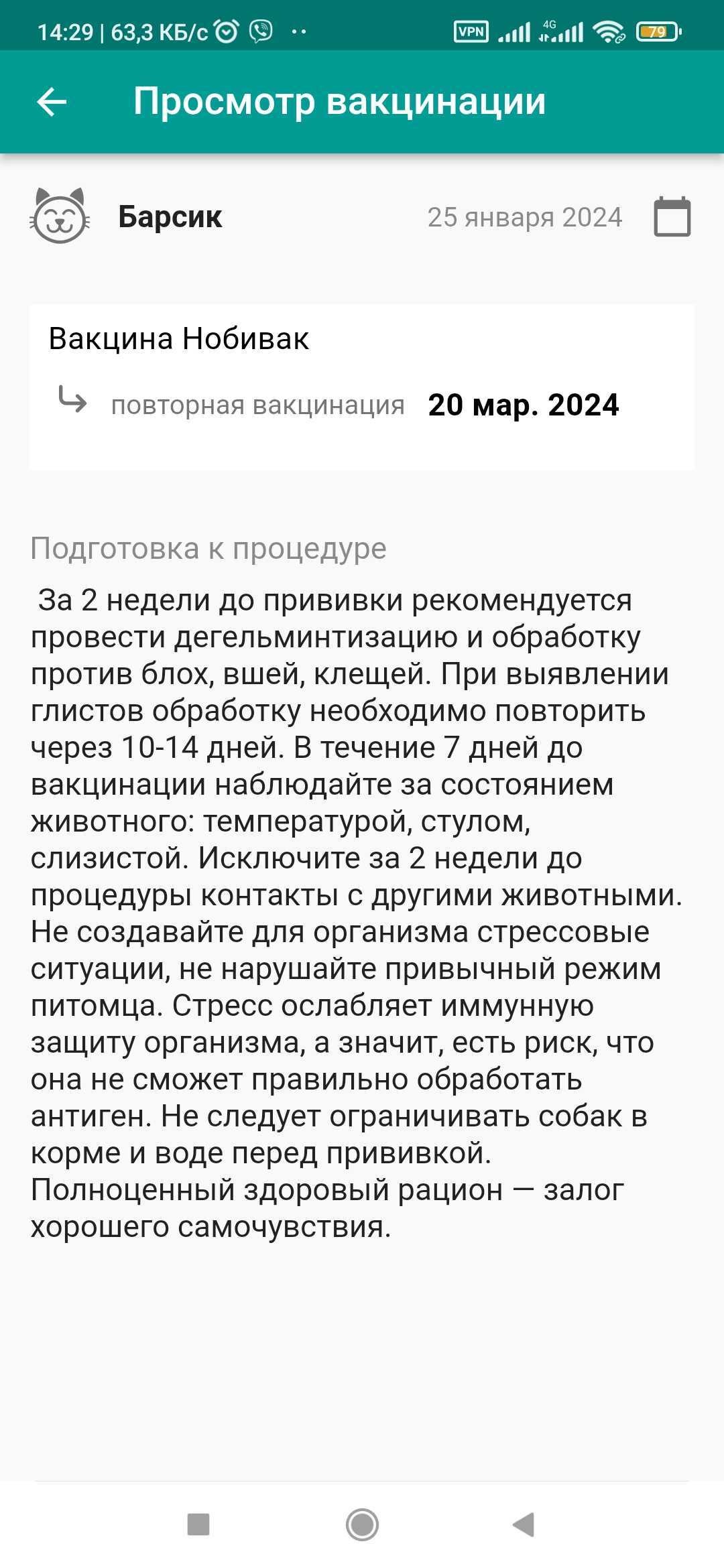 • даты прошедших/повторных вакцинаций (а также текст, как необходимо подготовить питомца к вакцинации);