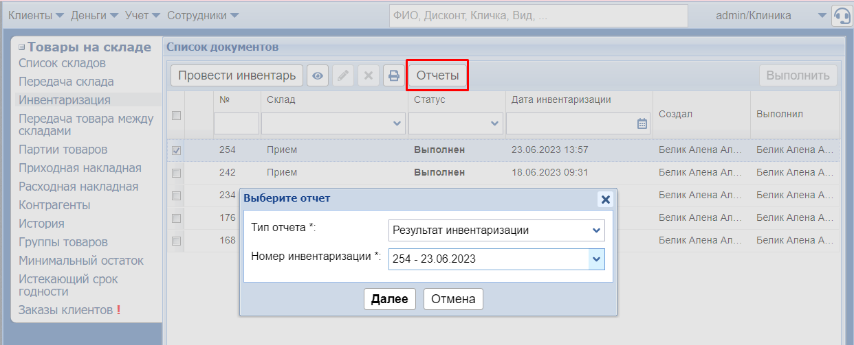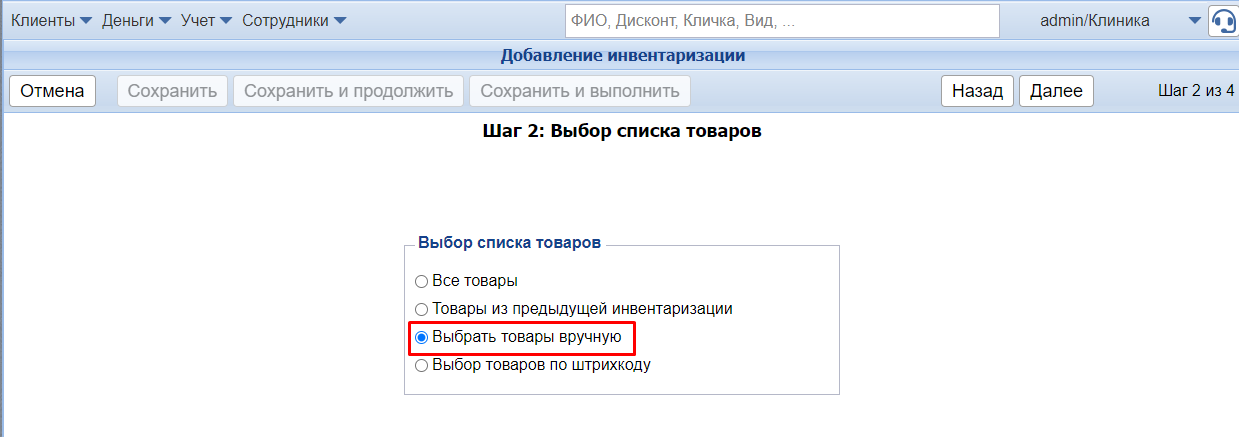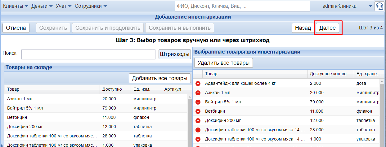 После того как все необходимые товары выбраны и находятся в окне Выбранные товары для инвентаризации, нажмите Далее.