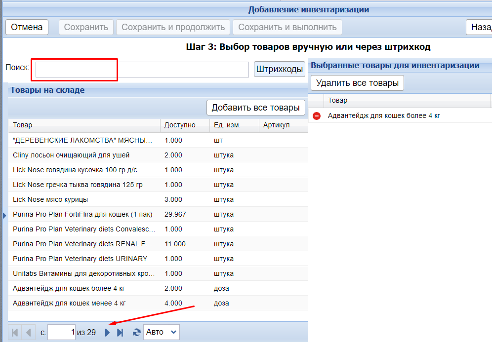 На следующей странице откроется список товаров этого склада. Также можно воспользоваться поиском, куда вводится название товара, по которому хотите провести инвентаризацию.