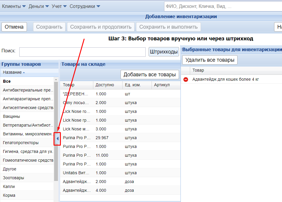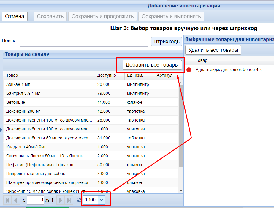 Чтобы добавить в инвентаризацию всю группу, выберите максимально количество строк вместо Авто и нажмите Добавить все товары