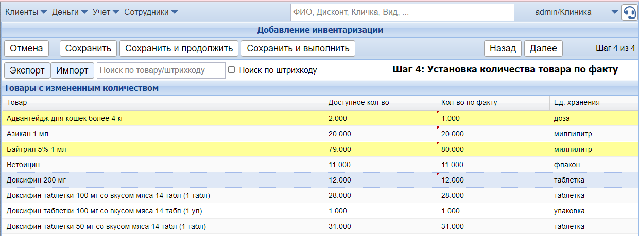 Строки, в которых доступное количество не совпадает с количеством по факту, будут подсвечены желтым.