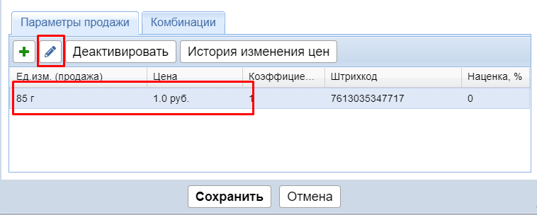 Чтобы изменить единицу продажи товара, необходимо зайти в модуль Товары и услуги - зайти в карточку товара (двойным кликом или нажав "редактировать" (карандаш) - во вкладке Параметры продажи выделить строку и нажать карандаш: