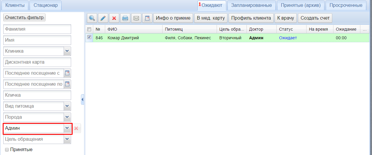Из вкладки Ожидают, если не отметить по программе прием принятым, клиент перейдет в Просроченные через 8 часов.