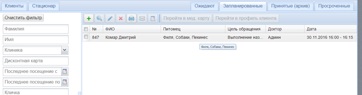 Здесь можно увидеть все запланированные визиты. В фильтре также можно указать различные данные. Например, если выбрать врача, отобразится список клиентов, запланированных на визит к конкретному доктору.