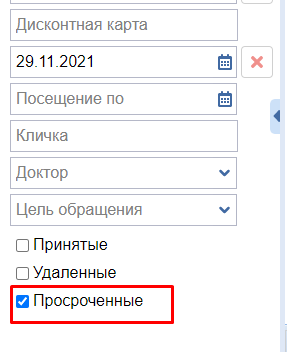 Чтобы посмотреть просроченные визиты, необходимо во вкладке Запланированные поставить в фильтре галочку Просроченные.