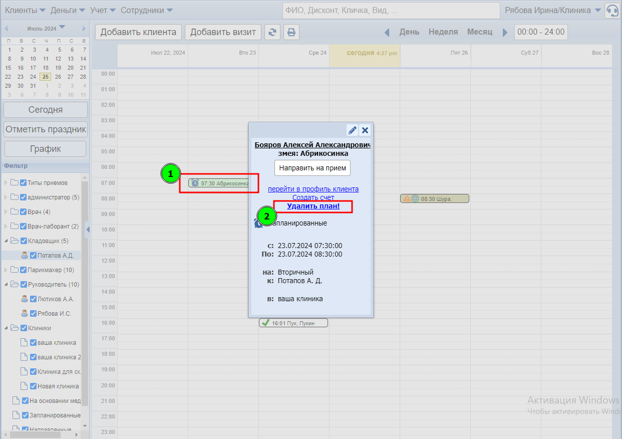 Бывают ситуации, когда создали запись на прием, но она теперь не актуальна (например, клиент пришел раньше или отменил визит). В таком случае нужно удалить из базы запланированную запись. Это можно сделать несколькими способами.
