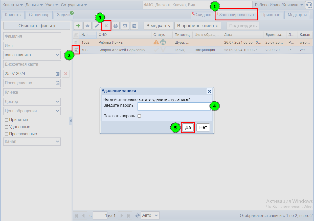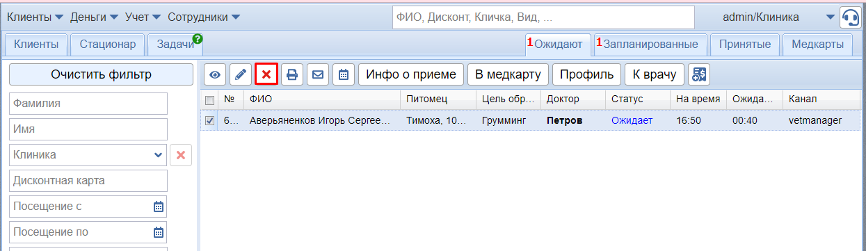 Обратите внимание: при удалении приема из вкладки Ожидают запись переходит во вкладку Запланированные. Если нужно вообще ее удалить, то следует перейти в Запланированные и сделать это там (как описано в прошлом пункте инструкции).