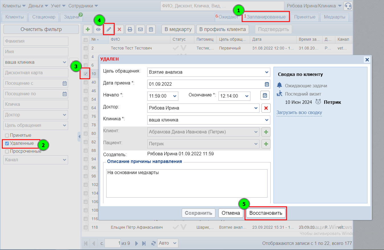 Если визит при удалении имел статус Запланирован, то после восстановления он вернется во вкладку Запланированные. Уберите галочку в фильтре на пункте Удаленные, чтобы снова просмотреть запланированные приемы.