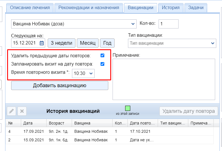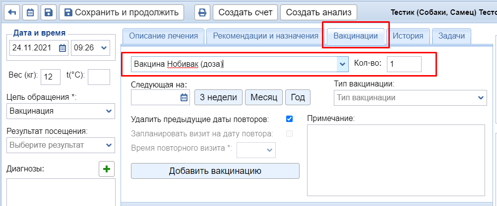 В поле Примечание можно указать серию и срок годности вакцины (эти данные потом можно будет вывести в отчете по вакцинации животных).