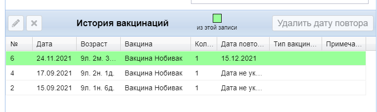 Когда все заполнено, жмем кнопку Добавить вакцинацию. В Истории вакцинаций появится новая строка зеленого цвета.