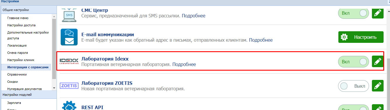 Перейдите в Настройки - Интеграция с сервисами - в строке Интеграция с Idexx нужно поставить ВКЛ и нажать карандаш.