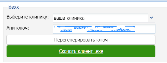 • В поле API KEY — ввести скопированный код при скачивании клиента (посмотреть можно Настройки - Интеграция с сервисами - Интеграция с IDEXX).