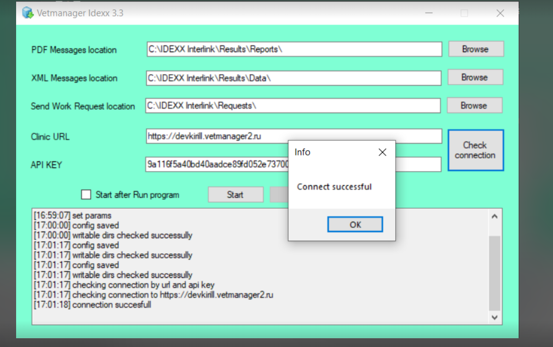 Дальше нажмите кнопку Check connection для проверки соединения. После появления сообщения об успешном соединении нажмите Start. После этого Vetmanager Idexx можно свернуть, настройка закончена.