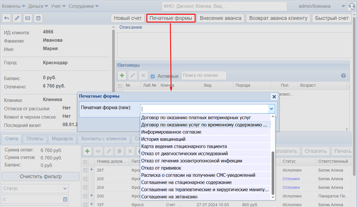 Чтобы распечатать необходимый документ для клиента, надо открыть его профиль и нажать кнопку Печатные формы.