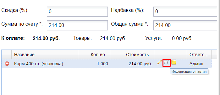 Если необходимо изменить партию товара (например, в случае, если счет создали давно и при его выполнении программа предупреждает, что есть неактивные партии), нужно при создании счета у добавленного товара нажать на иконку Информация о партии (тележка).