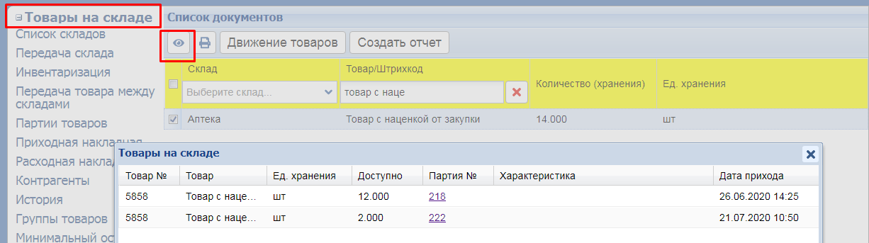 Как просмотреть остатки товаров на складе и информацию о партиях, детально описано здесь.