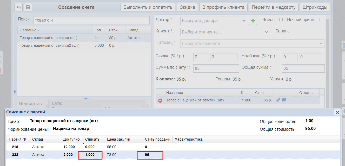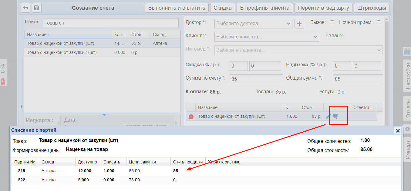 Перейдем в создание счета, добавим этот товар и нажмем корзинку напротив него. По умолчанию программа будет списывать товар по самой старой партии (п. 218, цена закупки 65 руб.) В счете сейчас указана цена продажи 85 руб. (65+30%=84,5 срабатывает округление до целого числа, получаем 85 руб).