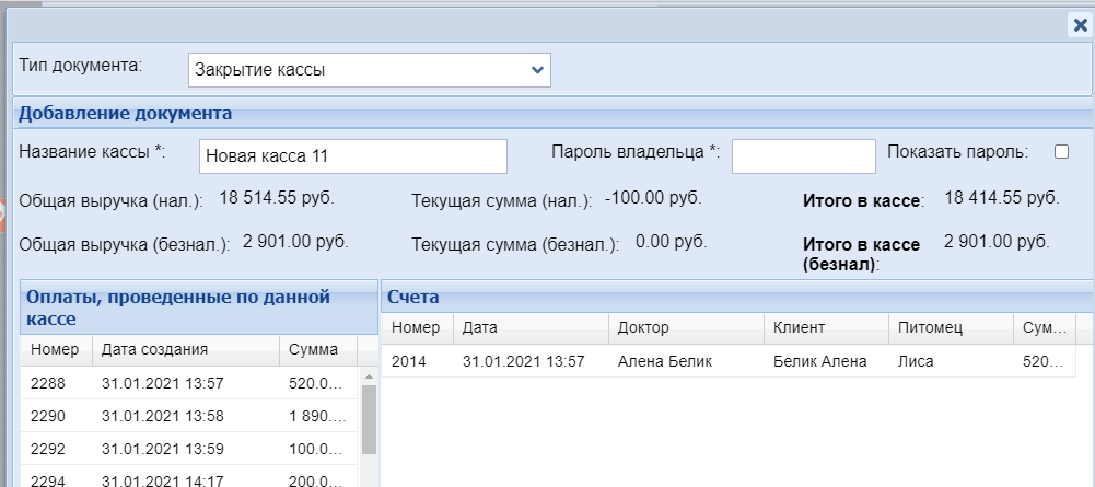 Важно! Будьте внимательны перед закрытием кассы, сверяйте правильность оплат, сумму в кассе программы Ветменеджер и реальную сумму в кассе.