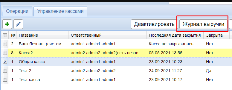 При закрытии кассы формируется журнал выручки по всем операциям в кассе с момента прошлого закрытия.