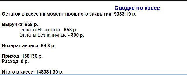 • Итого в кассе (остаток в кассе на момент прошлого закрытия + все оплаты — возврат аванса + приход — расход);
