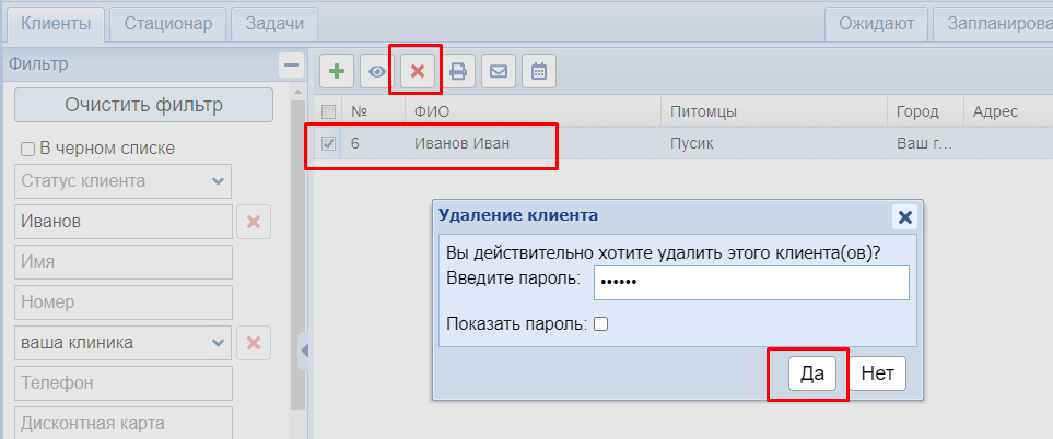 Найдите клиента в базе. Поставьте галочку в чекбоксе возле клиента, которого надо удалить, и нажмите кнопку Удалить (красный крест)