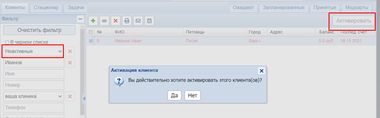 Чтобы восстановить удаленного клиента, нужно выставить в фильтре Статус клиента - Неактивные. Ввести в фильтр данные нужного клиента, отметить его галочкой и нажать Активировать. Подтвердить свои действия.