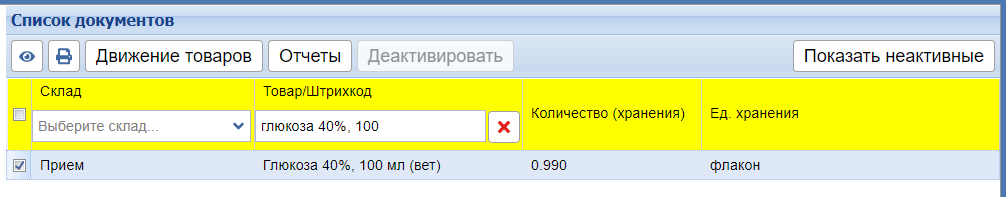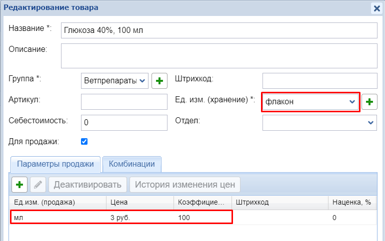 Вот пример: товар “Глюкоза 40%, 100 мл”, в одном флаконе 100 мл. Если этот товар должен приходоваться на склад во флаконах, а продаваться по миллилитрам, то его необходимо завести в программу следующим образом: