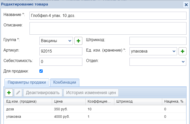 То же самое можно реализовать с упаковками и штуками. Можно также установить две единицы продажи. Например, если продаете товар и упаковками, и дозами, то можно добавить еще один параметр продажи.