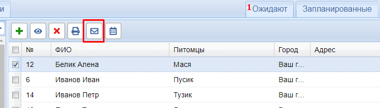 Чтобы отправить клиенту быстрое сообщение, необходимо выделить его в списке клиентов и нажать кнопку с конвертом.