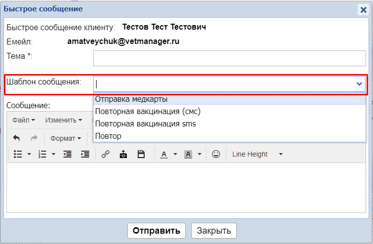 Если у вас настроена интеграция с сервисами рассылки смс-сообщений (смс-центр или др.), можно отправлять клиентам быстрое смс. А чтобы отправить быстрое письмо на почту из профиля клиента используется внутренний сервис "Электронная почта Ветменеджер".