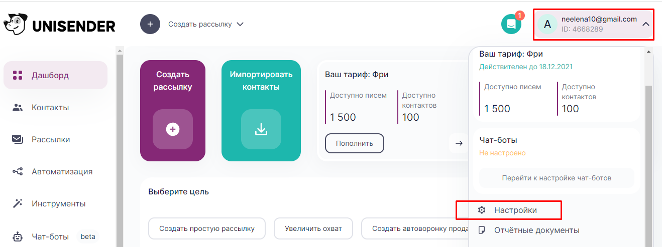1. Зарегистрируйтесь в Unisender. После регистрации выберите вариант Перейти к обзору. Зайдите в Настройки аккаунта.