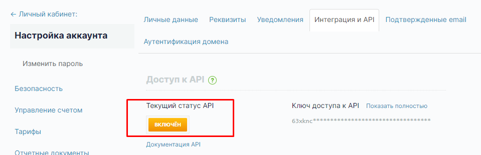 2. Во вкладке Интеграция и API  Текущий статус API должен быть включен. Рядом будет ключ доступа к API - скопируйте его.