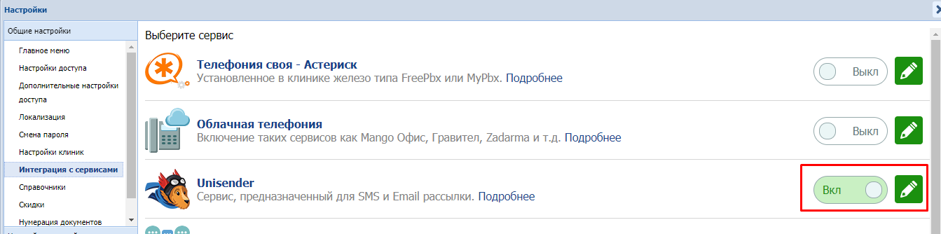 3. Перейдите в Ветменеджер. Зайдите в Настройки - Интеграция с сервисами - Unisender. Нажмите на редактирование настроек.