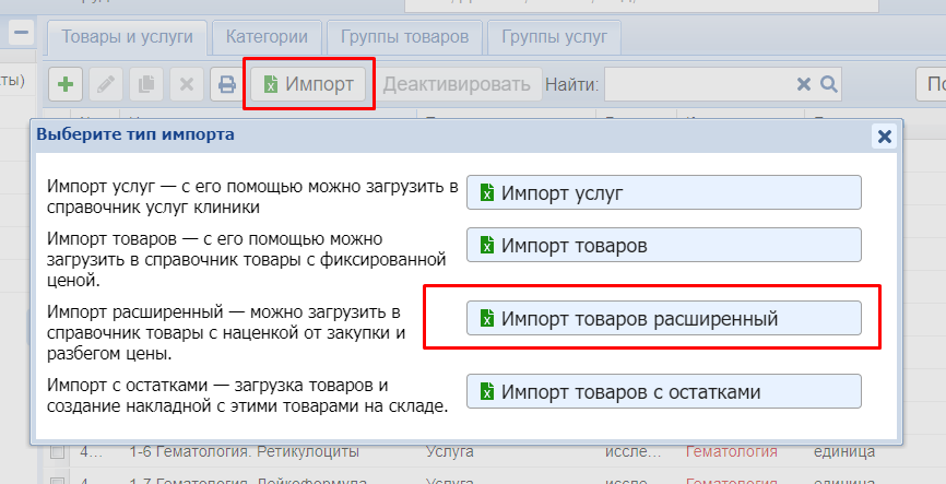 Перейти в модуль Товары и услуги, нажать кнопку Импорт - выбрать необходимый вариант (для загрузки товаров, нужно использовать кнопку Импорт товаров расширенный)