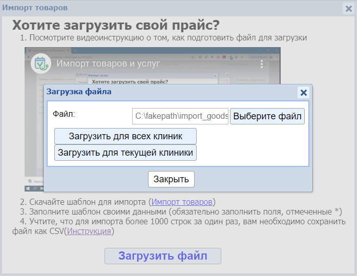 Выбрать на компьютере файл с измененными данными и далее нажать кнопку Загрузить для всех клиники (если нужно изменить цены во всех филиалах сети) или Загрузить для текущей клиники (для изменения цен только в текущем филиале).
