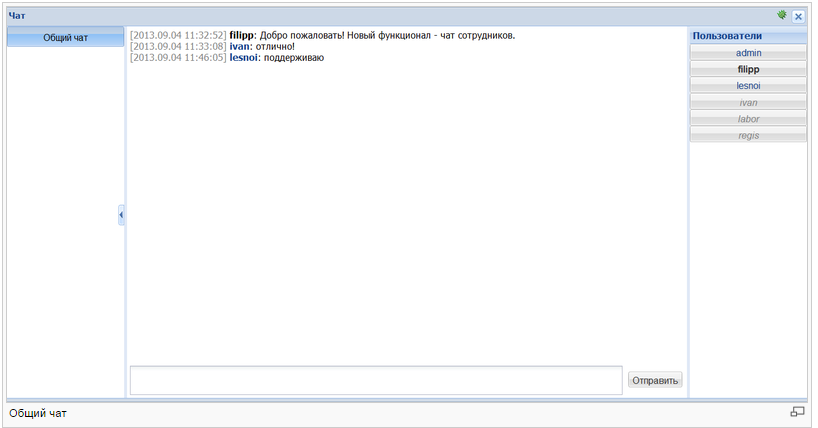 В правой части окна чата отображается список всех пользователей программы. Сортируются — сначала активные, затем не в сети (в алфавитном порядке)