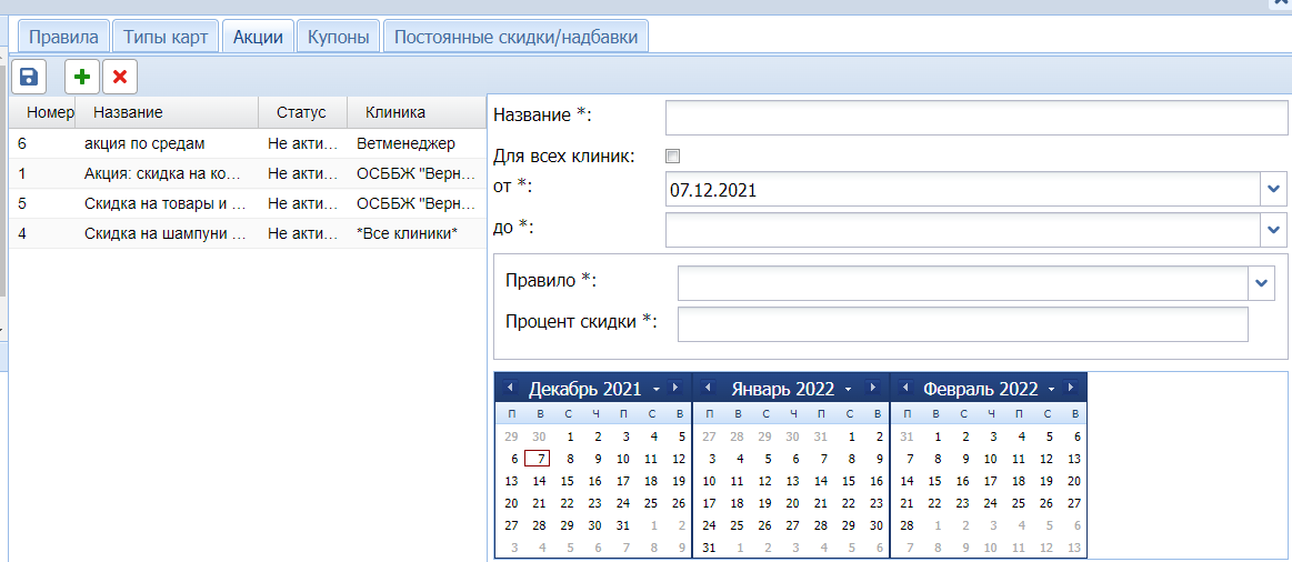 В программе Ветменеджер реализована возможность проведения различных акций. Условия для акций указываются теми же правилами, которые используются и для дисконтных карт.