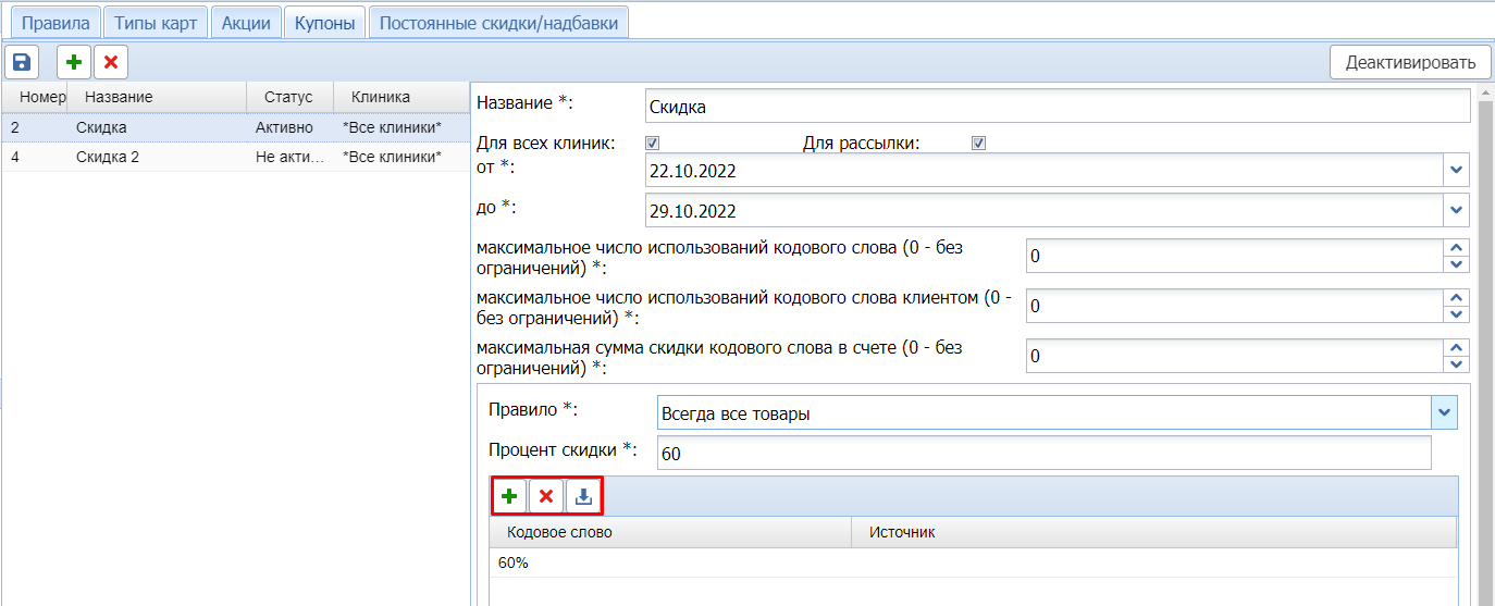 Выбор Для всех клиник означает, что купон может использоваться в любой клинике, независимо от того, где его создали. Например, купон добавили в Клинике 1, а счет с купоном можно пробить в Клинике 2