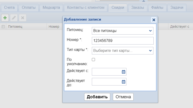 - Питомец - выберите питомца (если скидка должна распространяться только на счета конкретного питомца) или установите Все питомцы.