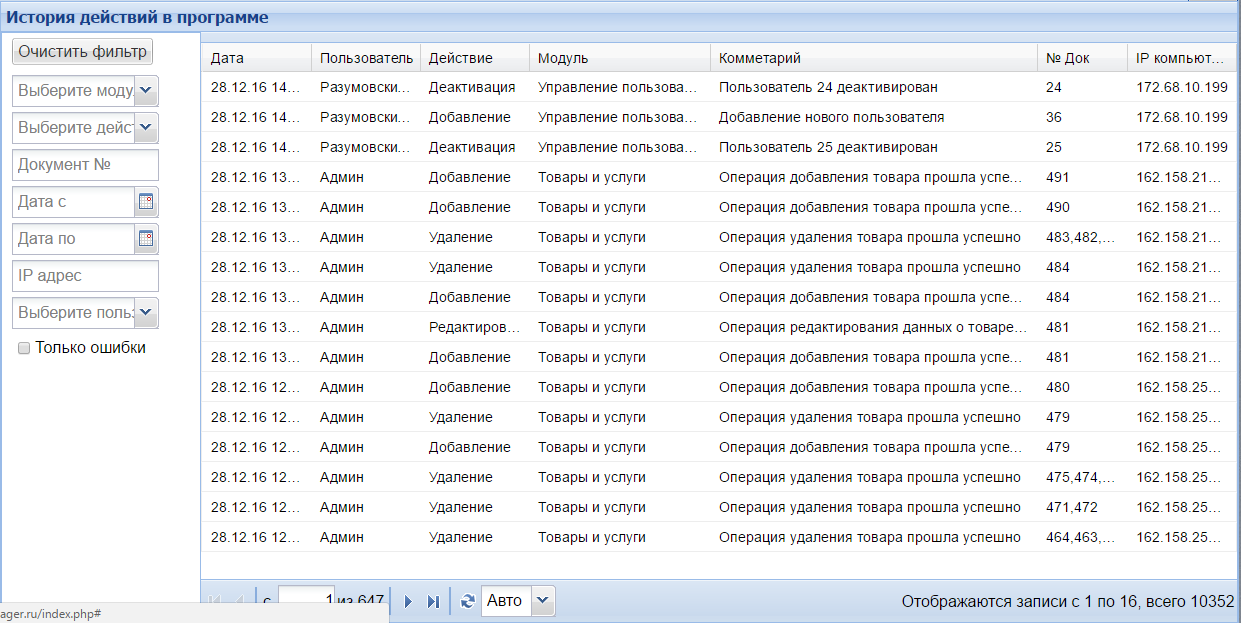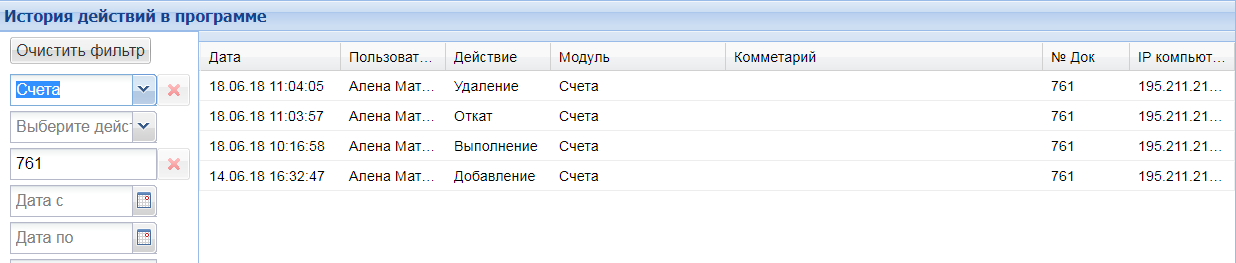 Есть возможность фильтровать записи по модулям программы, по действиям, по номеру документа, по дате создания документа, по IP-адресу пользователя и по действиям конкретного пользователя.