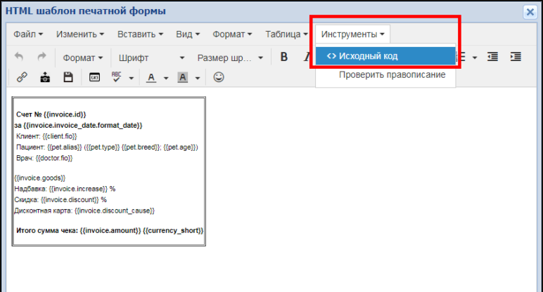 Жмем кнопку Редактировать html шаблон, затем жмем Инструменты — Исходный код. В открывшееся окно вставляем текст, который прикреплен в блокноте Здесь