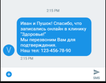 {{client.first_name}} и {{pet.alias}}! Спасибо, что записались онлайн в клинику «хххххх»