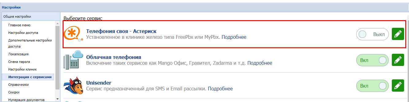 Перейдите в Настройки — Интеграция с сервисами — выберите раздел Телефония своя — Астериск — нажмите редактировать (карандаш).