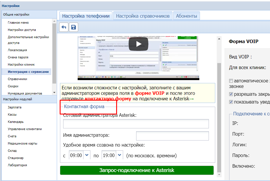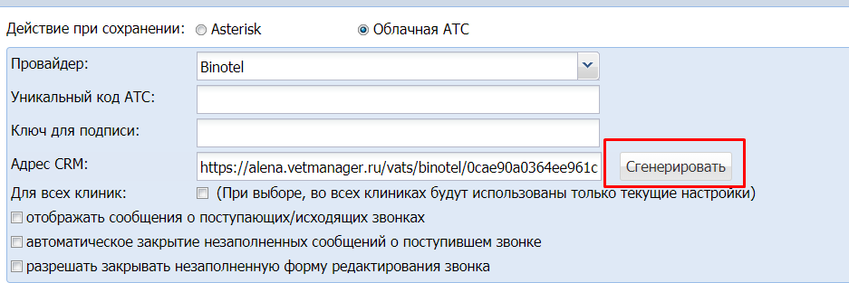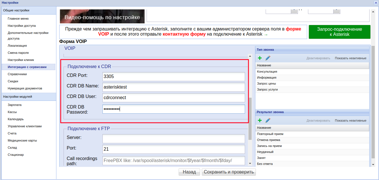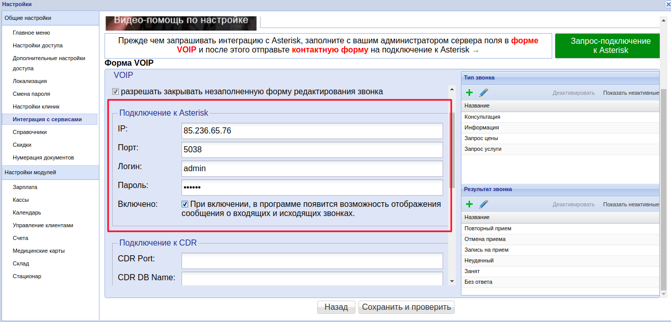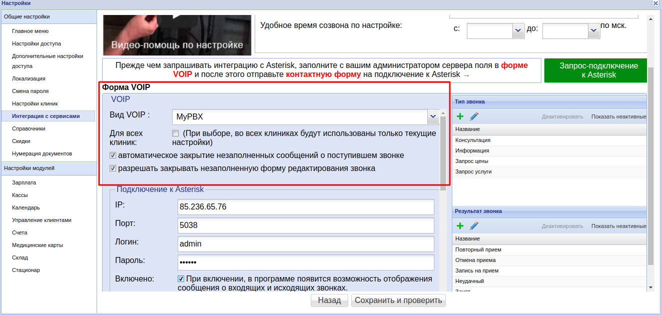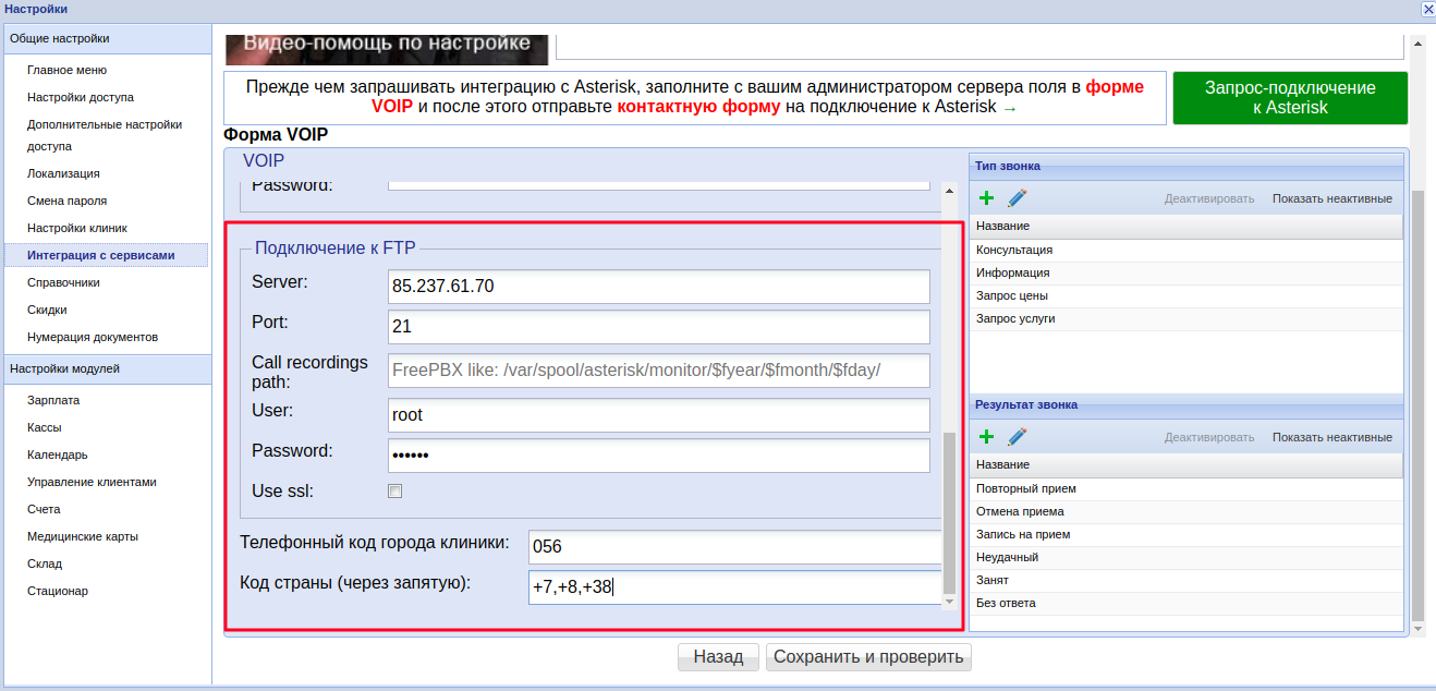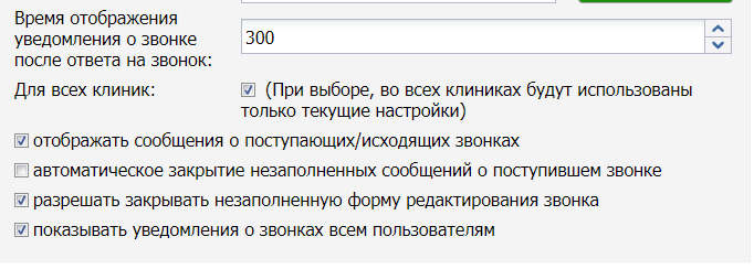 • Настройка Для всех клиник — текущие настройки VOIP будут применены во всех филиалах клиники. Если в каждой клинике стоит отдельное оборудование Asterisk, тогда эта галочка не выставляется.