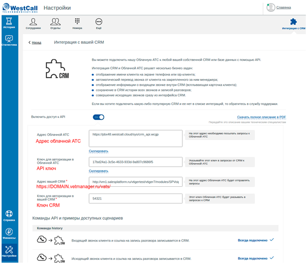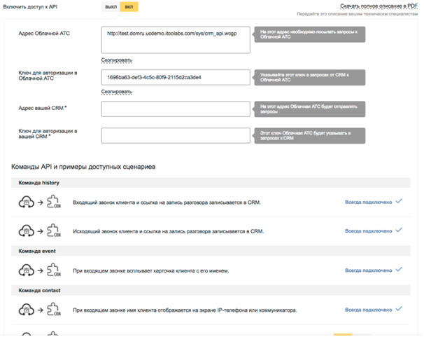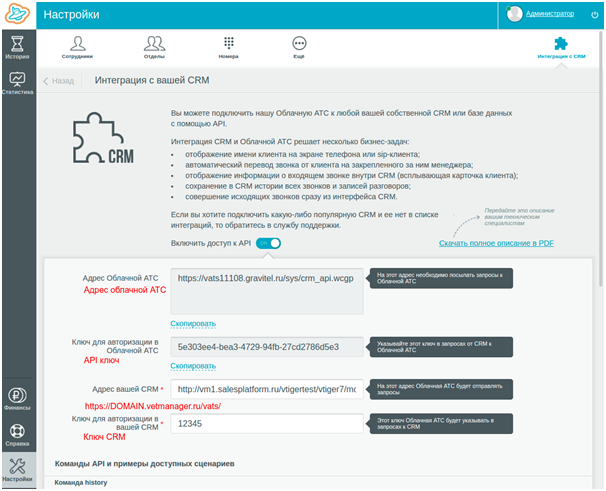 В личном кабинете в панели администратора в настройках интеграции нужно включить доступ к API и получить адрес облачной АТС и API ключ, а также заполнить поля Адрес вашей CRM и Ключ для авторизации в вашей CRM.