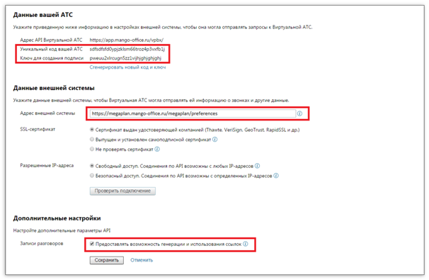 В ответ должно прийти письмо с API ключом (REST API key) и API паролем (secret), их нужно ввести в поля “Уникальный код АТС” и “Ключ для подписи”.