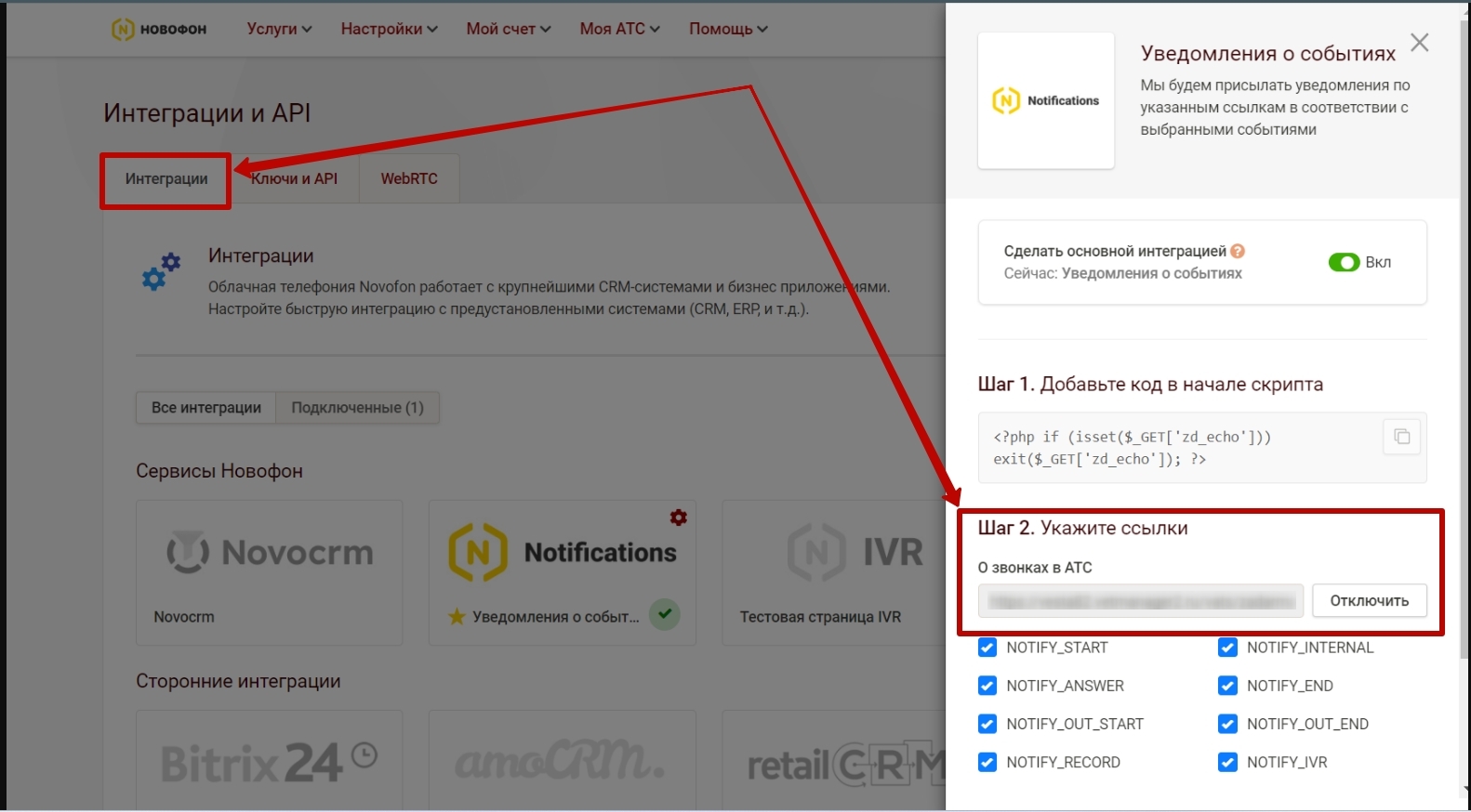 Для Новофон необходимо перейти в раздел Интеграции и добавить ссылку для оповещения о звонках.